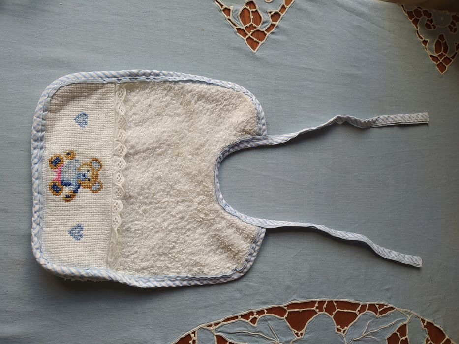 Babetes e quadros em ponto de cruz.